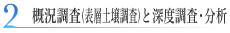 概況調査(表層土壌の調査)を行います。その結果を踏まえ深度調査を実施します。 概況調査で汚染が判明した場合はボーリング調査(深度調査)を行い深い位置の土壌汚染、地下水汚染等を明らかにします。 |