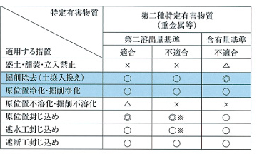 汚染指定区域に指定された場合、重金属等(第二種特定有害物質)は含有量基準と溶出量基準および第二溶出量基準に適合か不適合かによって、適用する措置対策が決められています(自然的原因の汚染土壌は適用外です)。